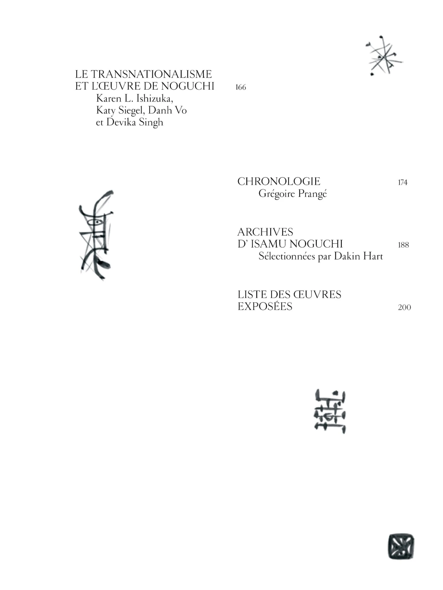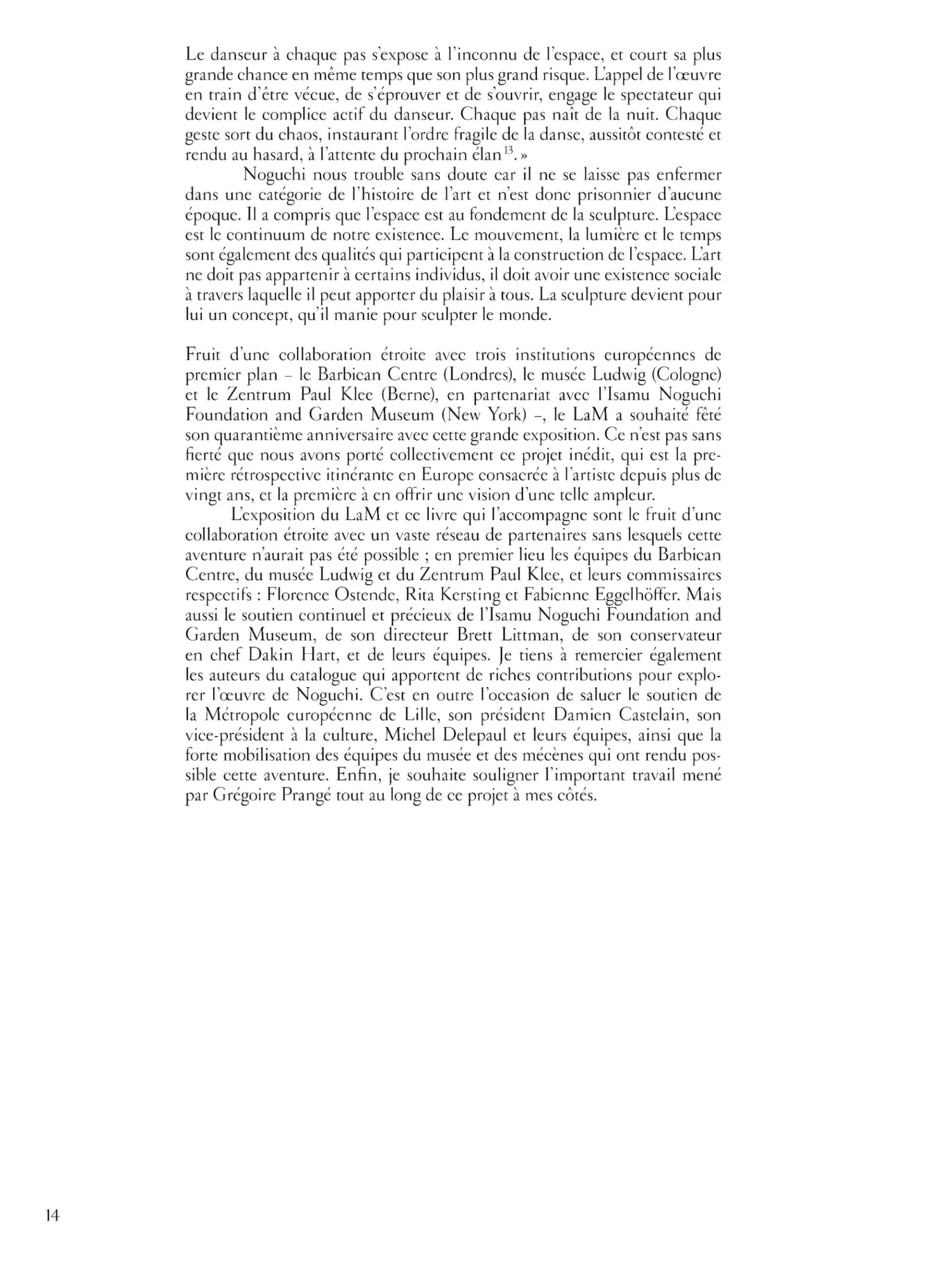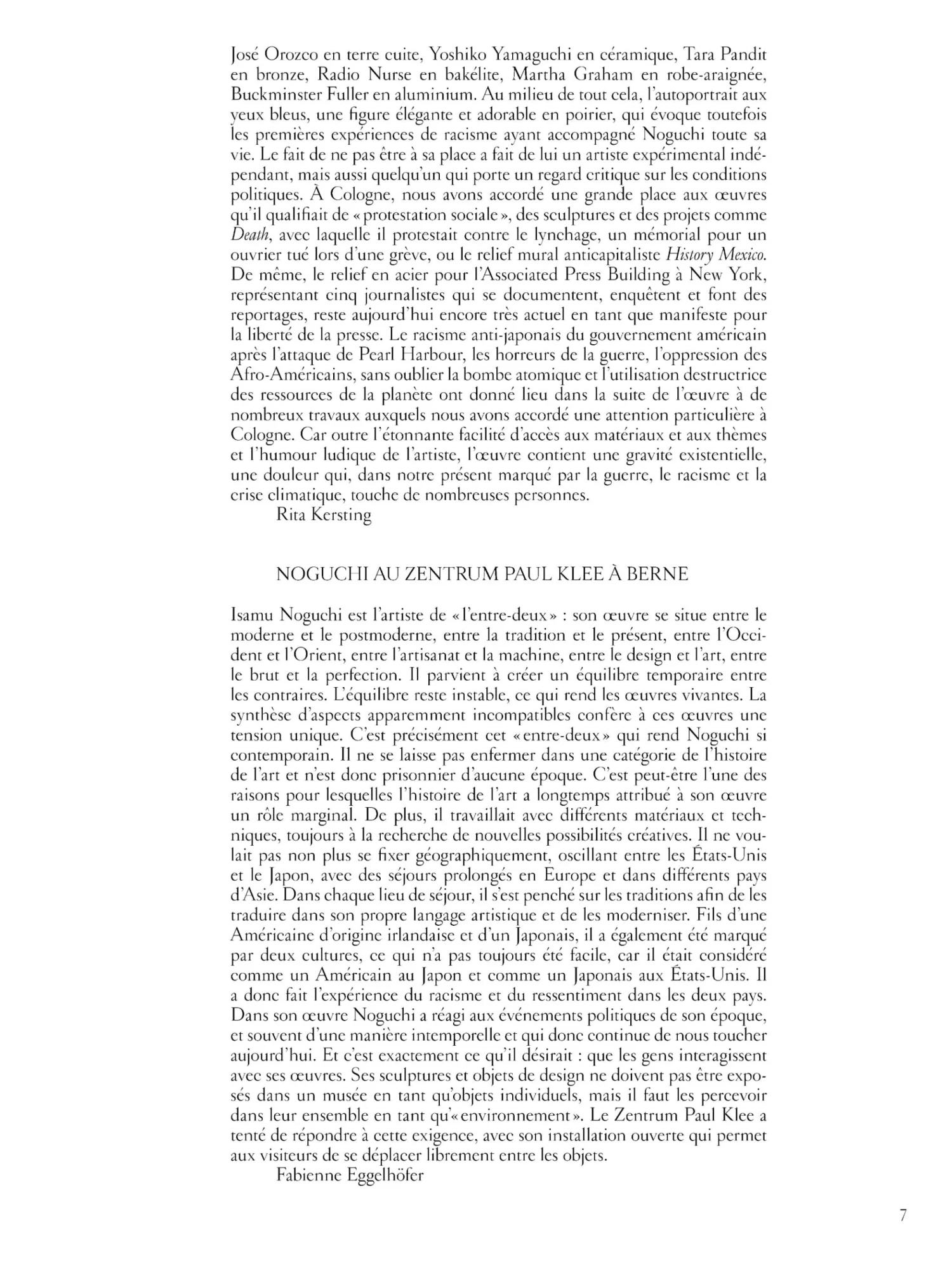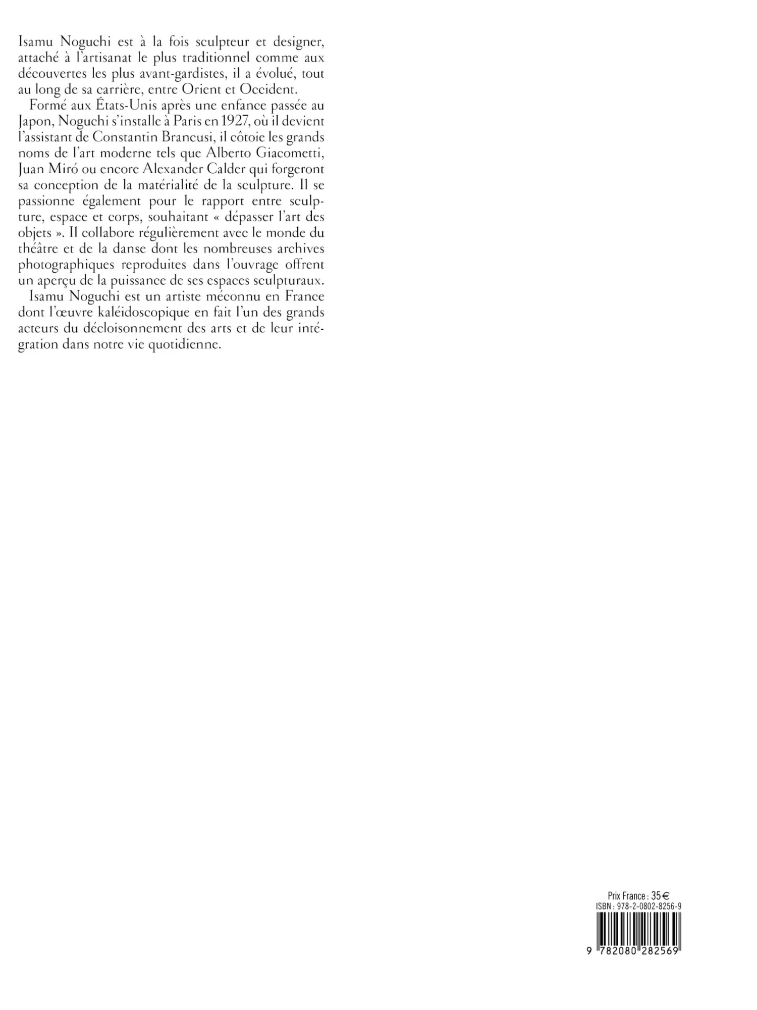 Formé aux États-Unis après une enfance passée au Japon, Noguchi s’installe à Paris en 1927, où il devient l’assistant de Constantin Brancusi, il côtoie les grands noms de l’art moderne tels que Alberto Giacometti, Joan Miró ou encore Alexander Calder qui forgeront sa conception de la matérialité de la sculpture, Il se passionne également pour le rapport entre sculpture, espace et corps, souhaitant « dépasser l’art des objets » . Il collabore régulièrement avec le monde du théâtre et de la danse dont les nombreuses archives photographiques reproduites dans l’ouvrage offrent un aperçu de la puissance de ses espaces sculpturaux.