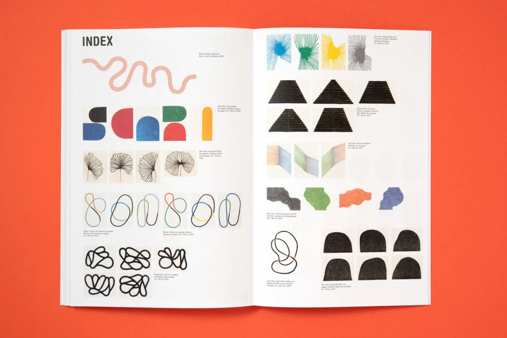 Les œuvres montrées dans cet ouvrage se distinguent à la fois par la variété des techniques utilisées – crayons de couleurs, graphite, stylo, feutre, plume, craie grasse, craie sèche, encre de Chine, encre colorée – mais aussi par la permanence de certains motifs comme les lignes et les boucles, les rubans ou les arabesques, les dessins noirs ou colorés, réalisés par série, représentant souvent des formes élémentaires.